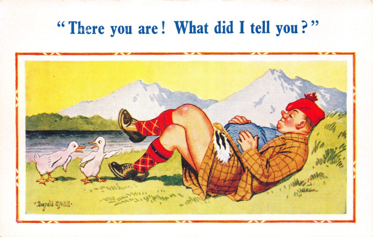 Here’s the image you were looking for I think. There may be variations - but this is a well known one like you describe, or your memory has combined two different postcards into one that is more likely than this !