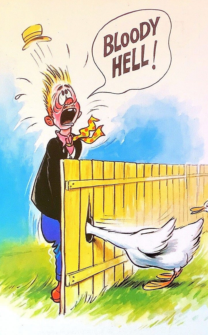 ‘‘a beautiful buxom & alluring blond haired woman is behind a fence, on the other side of the fence facing her is eager man with his pants half down his legs… hes 'inserted' himself through a hole in the fence, yet he's in utter shock… because behind the fence next to the alluring woman we (tho not he) can see a goose with its head at the same height of the pained mans midriff on the other side of the hole’’.